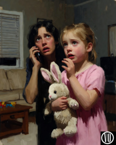 Lily’s eyes stayed fixed on the floor, tracing the long shadow of a lamp across the hardwood. Her fingers kept turning the bunny’s ear—slow, mechanical, like it was the only thing keeping her grounded.