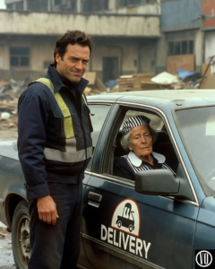 One afternoon, Chloe decided to bring lunch to Julian and Eleanor. She walked to the financial district, finding Julian parked on his delivery scooter outside a towering glass building. Eleanor was sitting on a bench nearby in her janitor uniform.