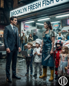 The scene cuts to the Brooklyn Fish Market. A crowd gathers around a stall. Julian Thorne, former billionaire, is expertly filleting a salmon, wearing a goofy apron that says “World’s Best Dad.” Aria is beside him, laughing. The four kids are doing their homework in the back.