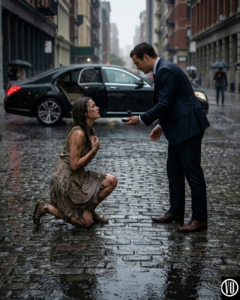 She ran out of the hotel, straight into another New York downpour. She sat on the curb, her heels ruined, her spirit finally fraying at the edges. Suddenly, the rain stopped hitting her. She looked up and saw a massive black umbrella. Standing above her was a man who looked like he had been carved from midnight and authority.