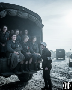 Elsbeth kept her head down as the truck jolted over a rut in the road. She was twenty-two, formerly a typist for a logistics bureau in Cologne, now a number on a clipboard. Beside her, pressed shoulder to shoulder on the wooden bench, were women she had known for three days. There was heavy-set Martha, who had worked in a munitions factory; quiet Liesl, who still wore a nurse’s armband stained with oil; and a dozen others, all grey-faced, all shivering.