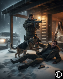 Echo launched from the porch like a silver streak. The dog didn’t go for the throat; he went for the arm. Marcus shrieked as he was slammed into the snow. Lucas was on him a second later, disarming him with a brutal, practiced efficiency that left Marcus gasping in the drift.