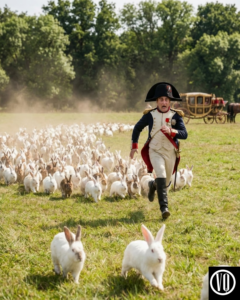 Napoleon was now waist-deep in bunnies. They were climbing his coat. One particularly ambitious rabbit—a large white buck—managed to leap onto the Emperor’s shoulder. It sat there, nibbling on the gold epaulette of his uniform.