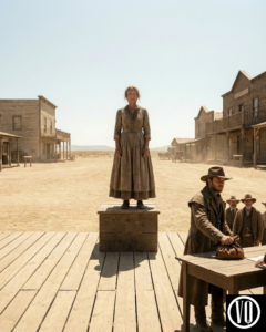 The voice cut through the heat like a crack of thunder. The crowd parted, turning to see a man striding forward. He was young—perhaps thirty—covered in the grime of the trail. His boots were worn, his duster coat stained with sweat, but his eyes, storm-gray and furious, held a clarity that terrified the auctioneer.