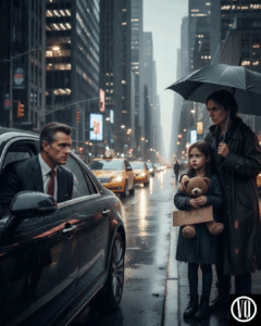 Yet, something was about to shatter that implacable rhythm. Stopped at a red light near Times Square, Alex’s hyper-focused gaze snagged on a face that was horribly out of sync with the urban landscape. On the corner of the sidewalk, shivering violently, a young woman was clutching a little girl fiercely to her chest, trying to shield the child from the deluge with her own meager body. She wore a thin, soaked winter coat; her slender arms trembled with a desperate, heartbreaking tenderness that was barely enough to ward off the frigid New York chill.