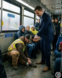 Leo stood near the back door, holding onto the yellow strap. He looked like the kind of man corporate America tries to ignore. He was wearing a heavy canvas Carhartt jacket stained with clay, steel-toed boots that had seen better decades, and a high-visibility vest that was currently unzipped. His hands were rough, the knuckles swollen from cold and hard labor.