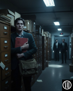 In that moment, he heard the heavy thud of the service elevator. It was 1:00 AM. No one should be coming down to the archives. Elias acted on instinct—he shoved the folder into his messenger bag, turned off his desk lamp, and ducked behind a row of filing cabinets.