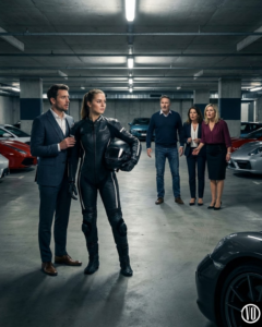 The crowd went silent as Jessica stepped out of the car. She pulled off her helmet, her hair cascading down her shoulders.