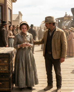 Carrick didn’t hesitate. He hoisted her trunk as if it were filled with feathers and helped her into the wagon. As they left the wooden storefronts of Willow Creek behind, the silence of the plains began to settle over them. The thud of the horses’ hooves was the only rhythm in a world that felt increasingly raw.
