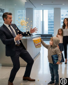 “Don’t lie to me, Mr. Thorne!” Toby shouted. He suddenly tripped, sending the entire bucket of greasy popcorn flying. It landed perfectly on Julian’s three-thousand-dollar jacket. “Oops. I guess I’m as clumsy as you are heartless!”