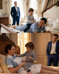 Returning home one evening, Alejandro is greeted by the butler with the usual formality, but the only thing he cares about is Lucas. He climbs the grand staircase, feeling the weight of failure with every step, and pauses when he sees the door to his bedroom ajar—a room he avoids, haunted by memories too sharp to touch. Inside, golden light spills onto the bed, where a maid in a blue uniform lies facedown, still wearing yellow gloves meant for cleaning. Lucas stands beside her, pressing a red toy stethoscope to her back with the seriousness of a surgeon. The maid, Elena, plays along, asking Lucas if her heart is sad or happy today. For the first time in years, Lucas smiles—a small, shy spark that shatters Alejandro’s defenses.