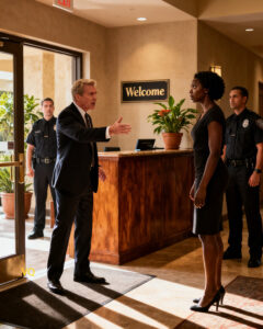 Guests began to move—subtly, but deliberately—stepping between Aisha and the front desk. They didn’t know her name yet, but they knew enough. One woman rolled her suitcase directly into Lauren’s path.